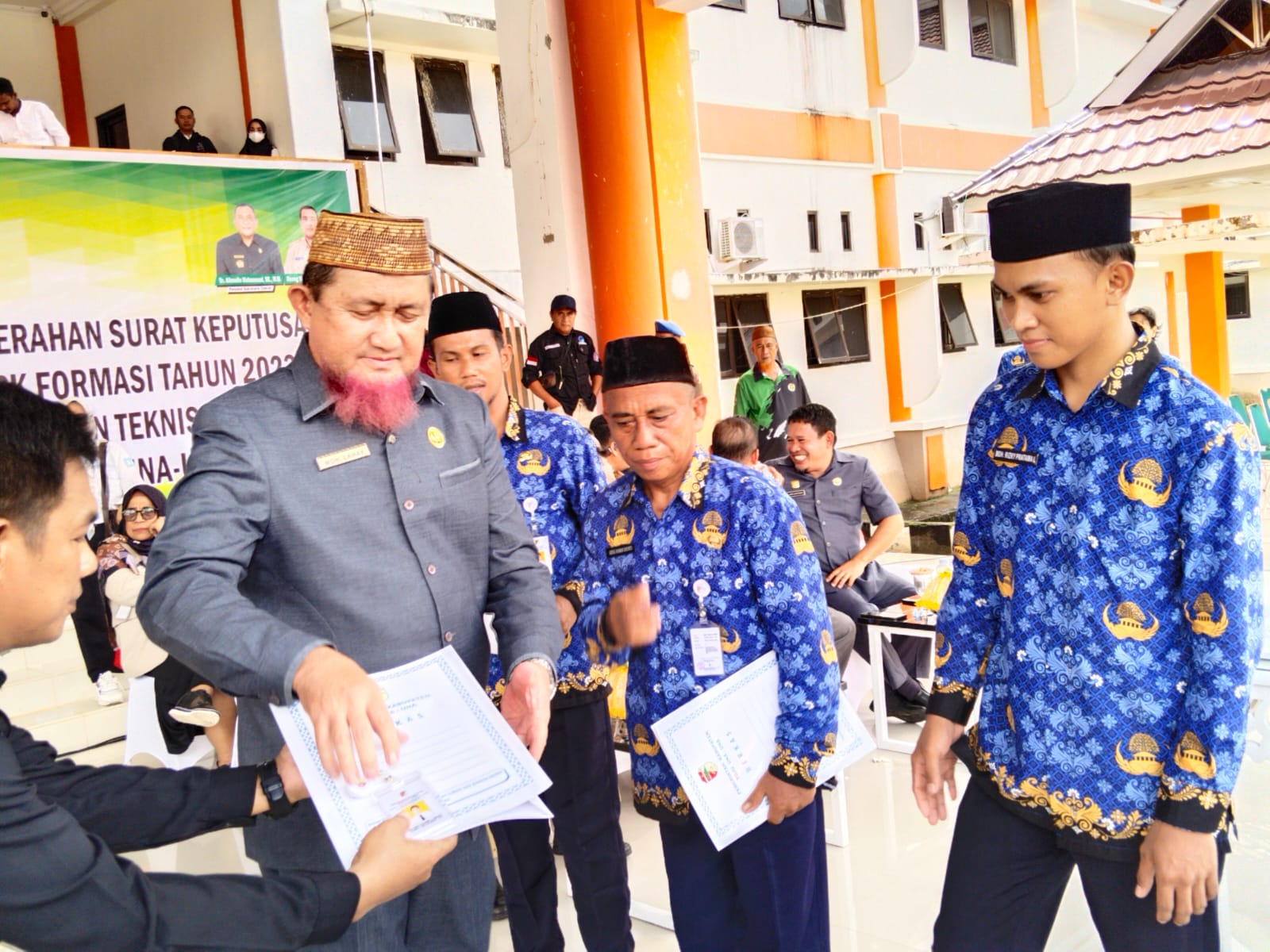 “Momentum ini tentu menjadi kebahagiaan dan kebanggaan tersendiri bagi saudara, karena hari ini adalah muara sekaligus garis start yang telah ditunggu-tunggu setelah melalui berbagai proses panjang bersamaan dengan diangkatnya sebagai PPPK, berdampak selaras pula pada peningkatan kesejahteraan, kepegawaian maupun karir,” ujar bupati.