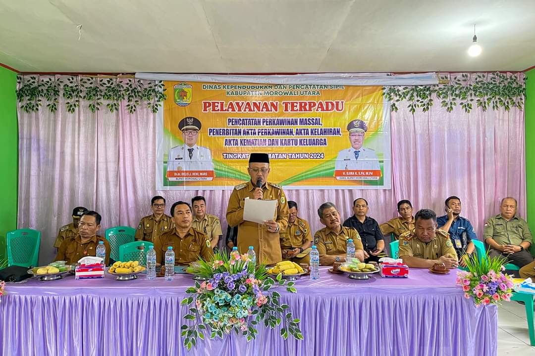 POSONEWS.ID – Rangkaian kegiatan Bupati Berkantor di Desa (Buka Desa) yang diselenggarakan di Desa Mohoni, Kecamatan Petasia Timur, Kabupaten Morowali Utara, Dinas Kependudukan dan Pencatatan Sipil (Dukcapil) Morowali Utara melaksanakan pencatatan perkawinan secara resmi terhadap 50 pasangan suami-istri (pasutri), Selasa (6/8/2024).
