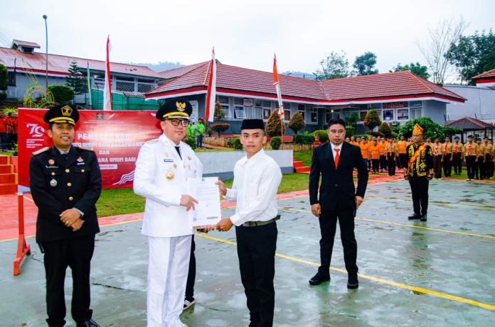 Bupati Morut Delis J. Hehi memimpin upacara peringatan HUT ke-79 Kemerdekaan RI di Lapas Kelas III Kolonodale, Sabtu pagi, 17 Agustus 2024.