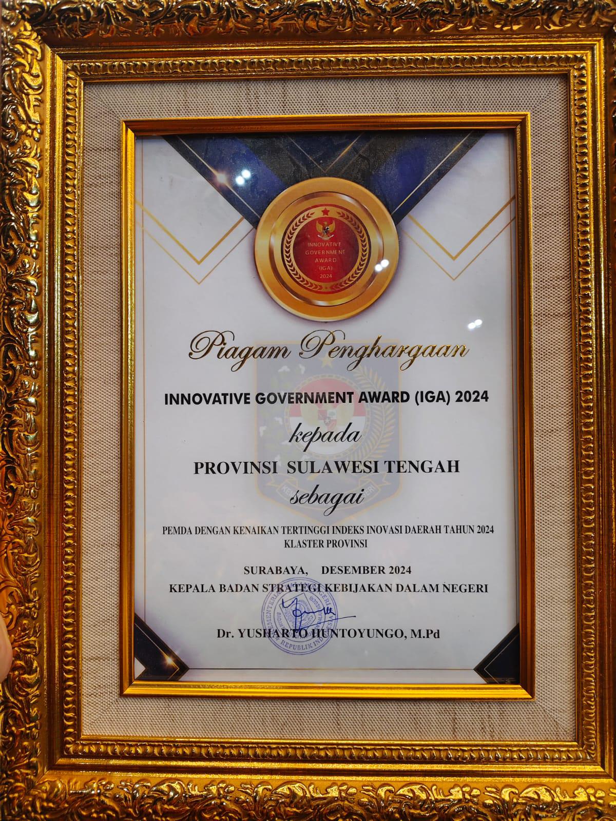 POSONEWS.ID – Pemerintah Provinsi Sulawesi Tengah meraih penghargaan dalam ajang penganugrahan penghargaan Innovative Government Award (IGA) oleh Badan Strategi Kabijakan Dalam Negeri Kementerian Dalam Negeri (BSKDN Kemendagri), dengan kategori Pemerintah Daerah Dengan Kenaikan Tertinggi Indeks Inovasi Daerah (IID) tahun 2024 Klaster Provinsi. Bertempat, di Hotel Mercure Surabaya. Kamis, (5/12/2024).