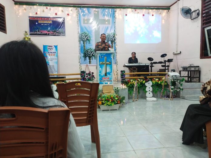 POSONEWS.ID – Dalam suasana penuh hikmat, Aiptu Halput Tarusu, S.Th, yang juga merupakan Rohaniawan Kamtibmas, menghadiri dan mengikuti ibadah Natal yang berlangsung di Gereja Sidang Jemaat Allah (GSJA) Agape, Kelurahan Kasintuwu, Kecamatan Poso Kota Utara, Kabupaten Poso, pada Jumat (13/12/2024).