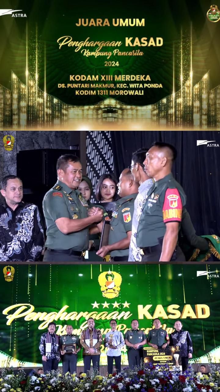 Penghargaan bergengsi ini diterima langsung oleh Komandan Kodim 1311/Morowali, Letkol Inf Alzaki, bersama Kepala Desa Puntari Makmur dan Babinsa Desa Puntari Makmur. Trofi, piagam penghargaan, dan uang pembinaan diserahkan oleh Kepala Staf Angkatan Darat (Kasad), Jenderal TNI Maruli Simanjuntak, M.Sc.