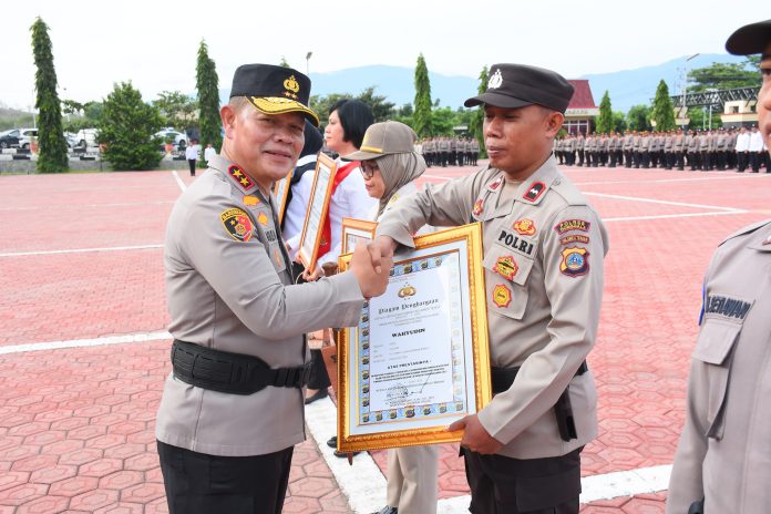 POSONEWS.ID – Kepala Kepolisian Daerah (Kapolda) Sulawesi Tengah, Irjen Pol. Dr. Agus Nugroho, memberikan piagam penghargaan kepada Satuan Kerja (Satker) dan sejumlah personel yang berprestasi di bidang administrasi keuangan Polri pada kegiatan apel pagi yang berlangsung, pada Senin (6/1/2025).
