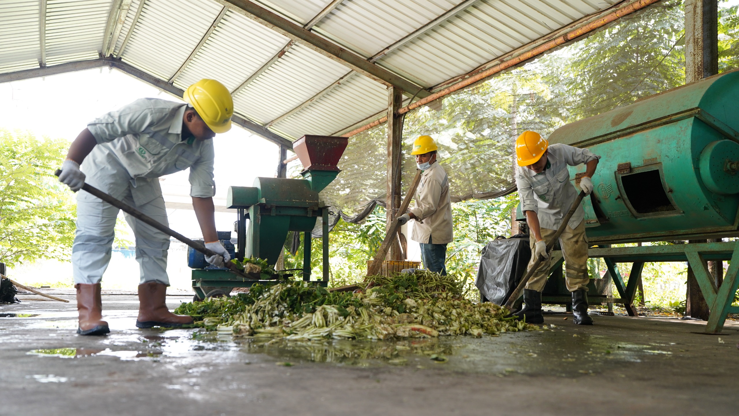 Sampah organik dari sisa makanan diolah dengan melakukan pencacahan terlebih dahulu menjadi beberapa potongan kecil. Kemudian masuk pada tahap pencampuran melalui metode biologis (bioremediasi), dengan memanfaatkan mikroorganisme sebagai aktivator pengurai. Setelah itu dialihkan untuk diolah menjadi kompos dan pakan maggot.