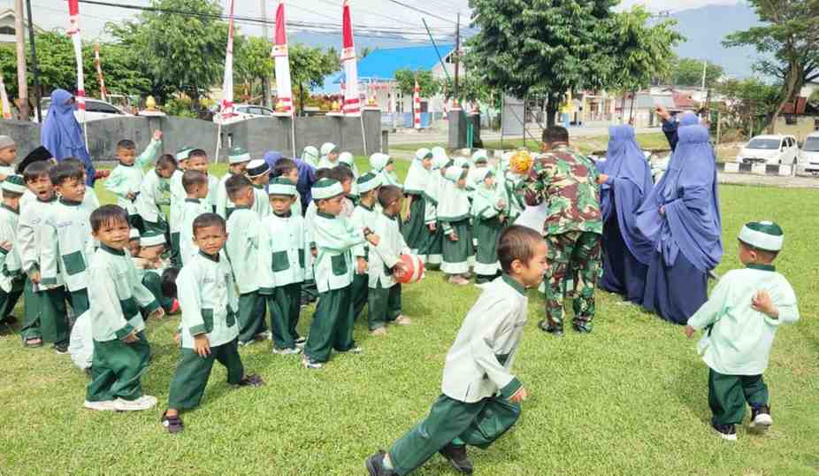 POSONEWS.ID – Ratusan santri cilik dari Sekolah Tahfidzh Anak Usia Dini (TAUD) RA Al-Marhamah II, Kelurahan Tabalu, Kecamatan Poso Pesisir, antusias mengikuti pembelajaran kebangsaan bersama prajurit Koramil 1307/09 Poso Pesisir (Pospes), Selasa (26/8).
