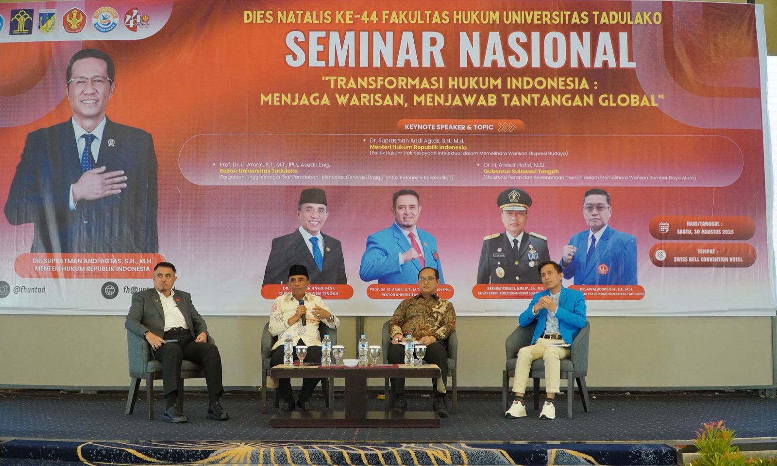 Dalam forum yang dihadiri Rektor Untad Prof. Dr. Ir. Amar, ST., MT., IPU., ASEAN Eng, Dirjen AHU Kementerian Hukum dan HAM Dr. Widodo, SH, MH, serta pimpinan Forkopimda Sulteng, Gubernur Anwar Hafid menyebut hukum harus menjadi panglima dalam mewujudkan kesejahteraan rakyat.