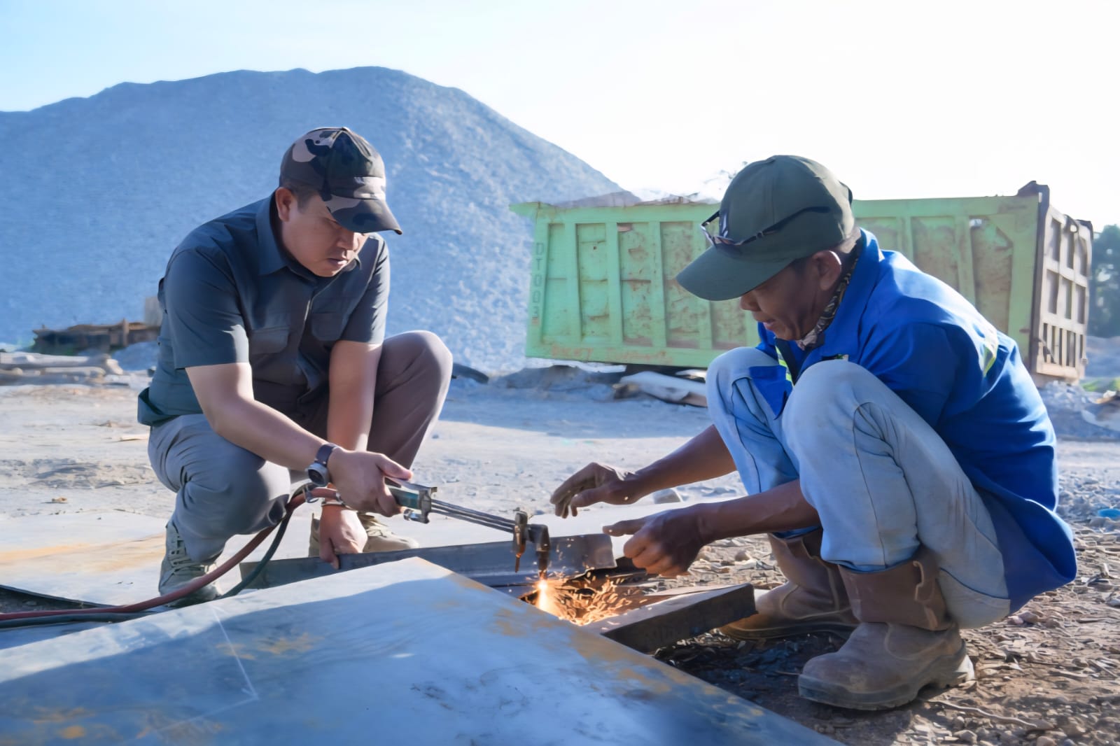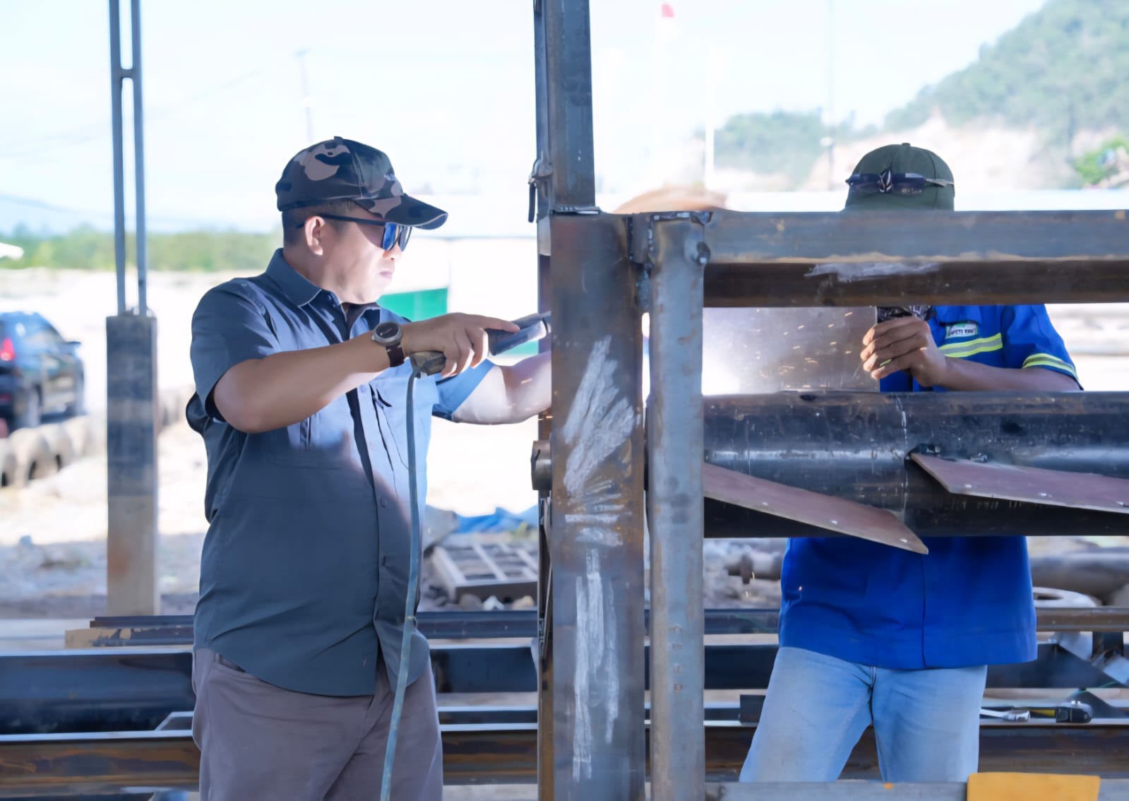 Menariknya, Bupati tidak hanya hadir untuk memantau, tetapi juga ikut terlibat dalam proses perakitan. Ia terlihat memegang peralatan kerja, melakukan pengelasan, hingga memotong besi untuk konstruksi mesin.