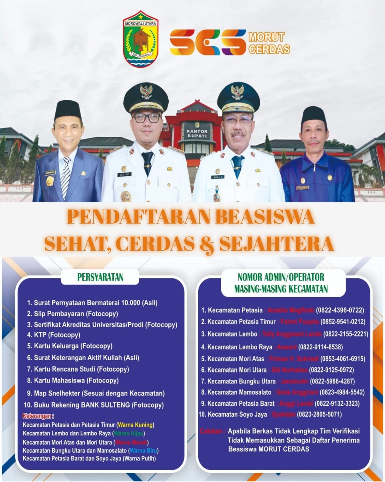 POSONEWS.ID – Pemerintah Kabupaten Morowali Utara melalui program Morut Cerdas kembali membuka pendaftaran Beasiswa Sehat, Cerdas & Sejahtera (SCS) bagi mahasiswa asal Morowali Utara.