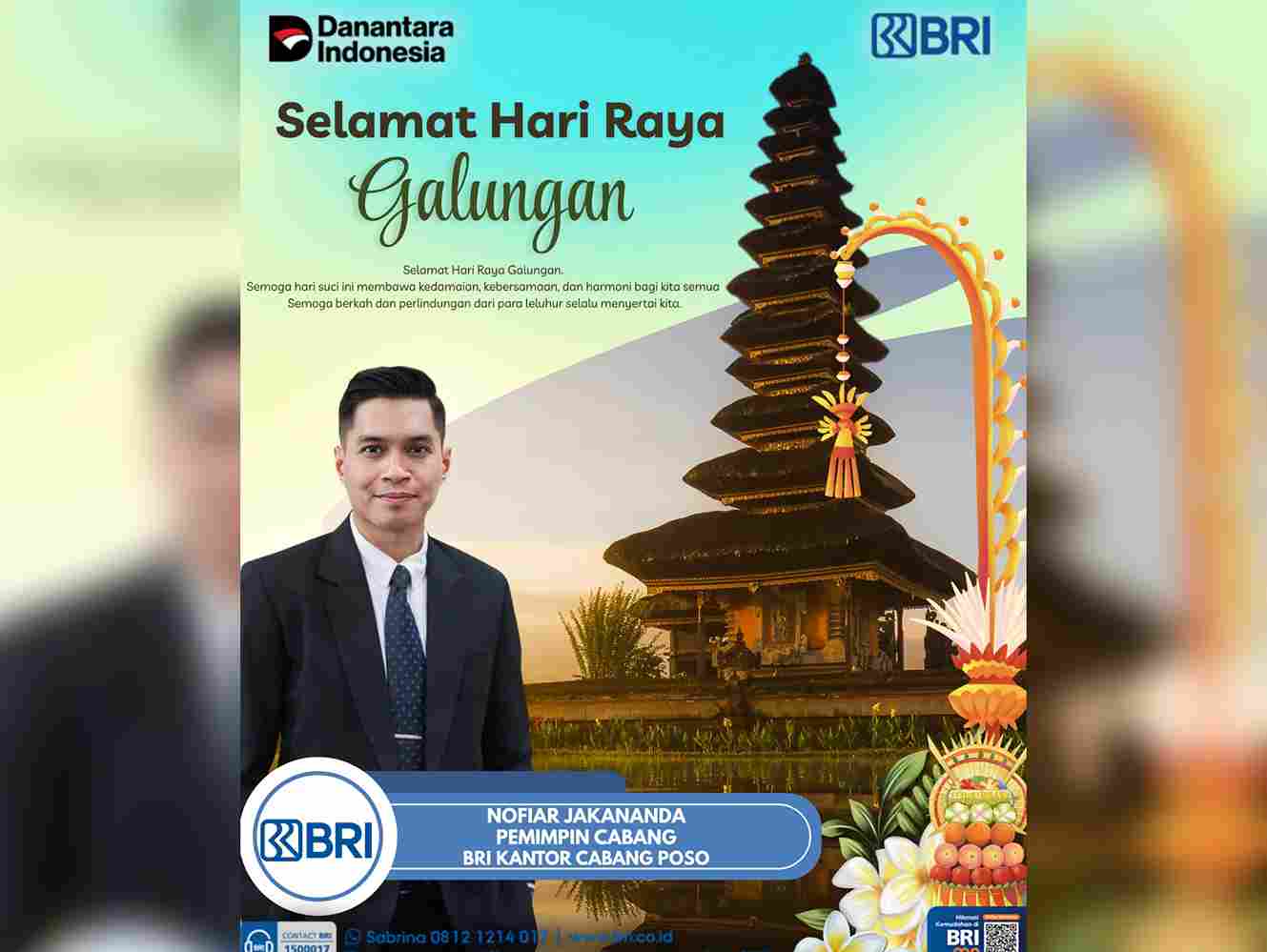 “Atas nama keluarga besar BRI Poso, kami mengucapkan selamat Hari Raya Galungan. Semoga perayaan ini membawa kedamaian, keberkahan, dan semangat kebaikan bagi seluruh umat Hindu di Poso maupun di mana pun berada,” ujar Nanda.