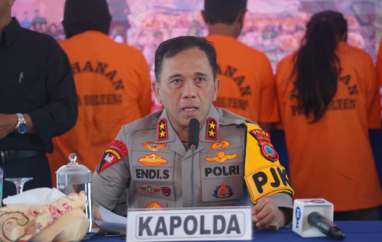 Konferensi pers digelar di lobi utama Mapolda Sulteng, pada Selasa, (18/11/2025). Kapolda Sulteng Irjen Endi Sutendi didampingi Kabidhumas Kombes Pol Djoko Wienartono serta Dirresnarkoba Kombes Pol Pribadi Sembiring. Dalam kesempatan itu, sejumlah barang bukti turut dihadirkan bersama lima tersangka yang diamankan.