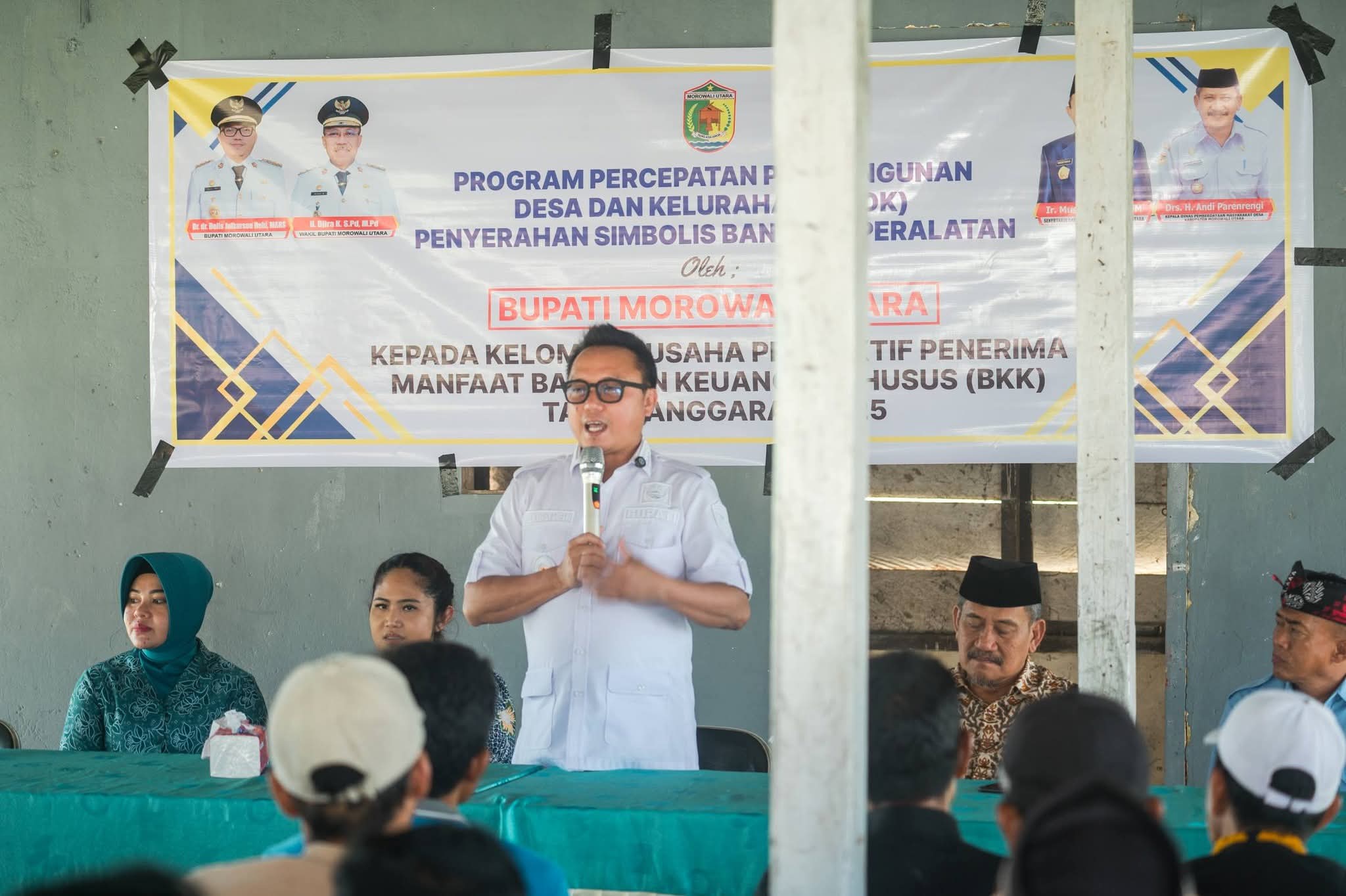 POSONEWS.ID – Bupati Morowali Utara, Delis Julkarson Hehi, menyerahkan Bantuan Keuangan Khusus (BKK) berupa peralatan dan dukungan pengembangan usaha kepada kelompok penerima manfaat di Kecamatan Soyojaya. Penyerahan bantuan dilakukan secara simbolis di Balai Desa Pancamakmur, Kamis sore (5/3/2026).