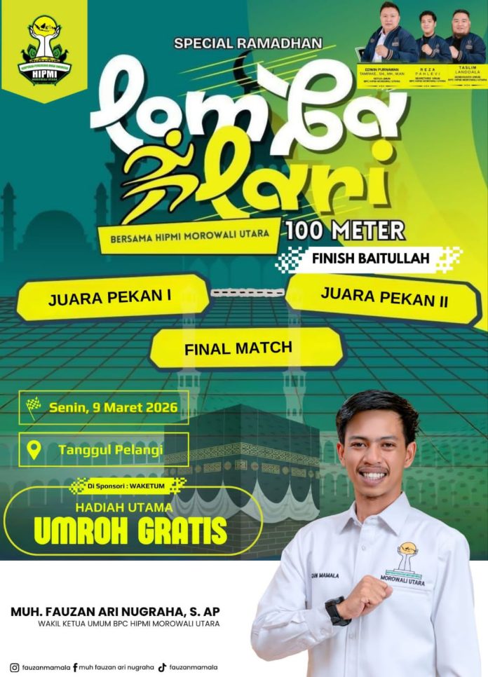 POSONEWS.ID – Momentum Ramadan dimanfaatkan oleh BPC HIPMI Morowali Utara (Morut) untuk menghadirkan kegiatan yang tidak hanya menghibur, tetapi juga sarat makna spiritual. Melalui lomba lari 100 meter yang digelar di kawasan Tanggul Pelangi Kolonodale, para peserta tidak sekadar berkompetisi memacu kecepatan, tetapi juga mengejar hadiah istimewa: perjalanan ibadah umroh ke Tanah Suci.