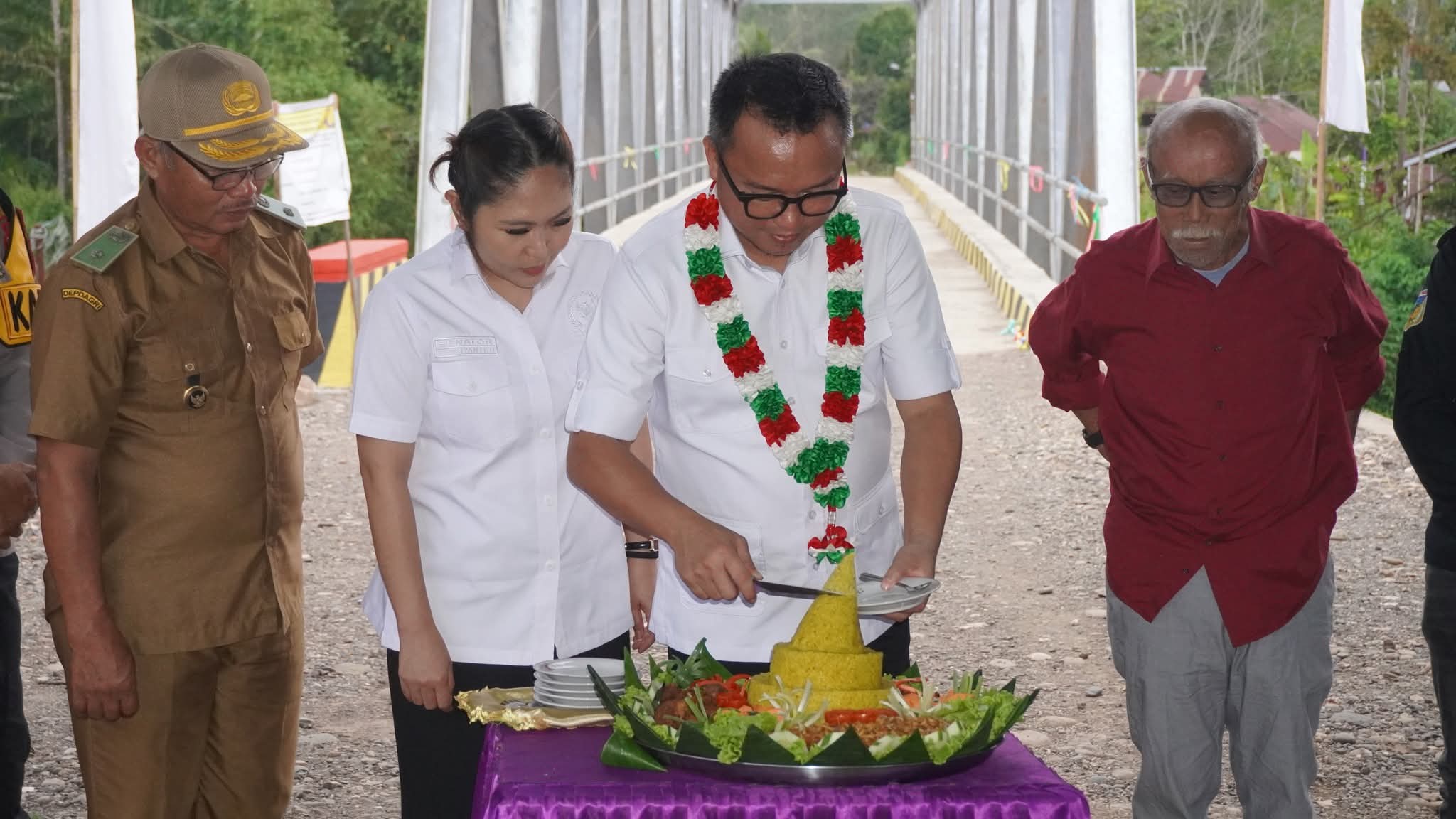 Peresmian jembatan ditandai dengan pengguntingan pita oleh Bupati Delis didampingi oleh Ketua TP-PKK Morut sekaligus anggota DPD RI Sulteng Ny. Febriyanthi dilanjutkan dengan peninjauan jembatan.